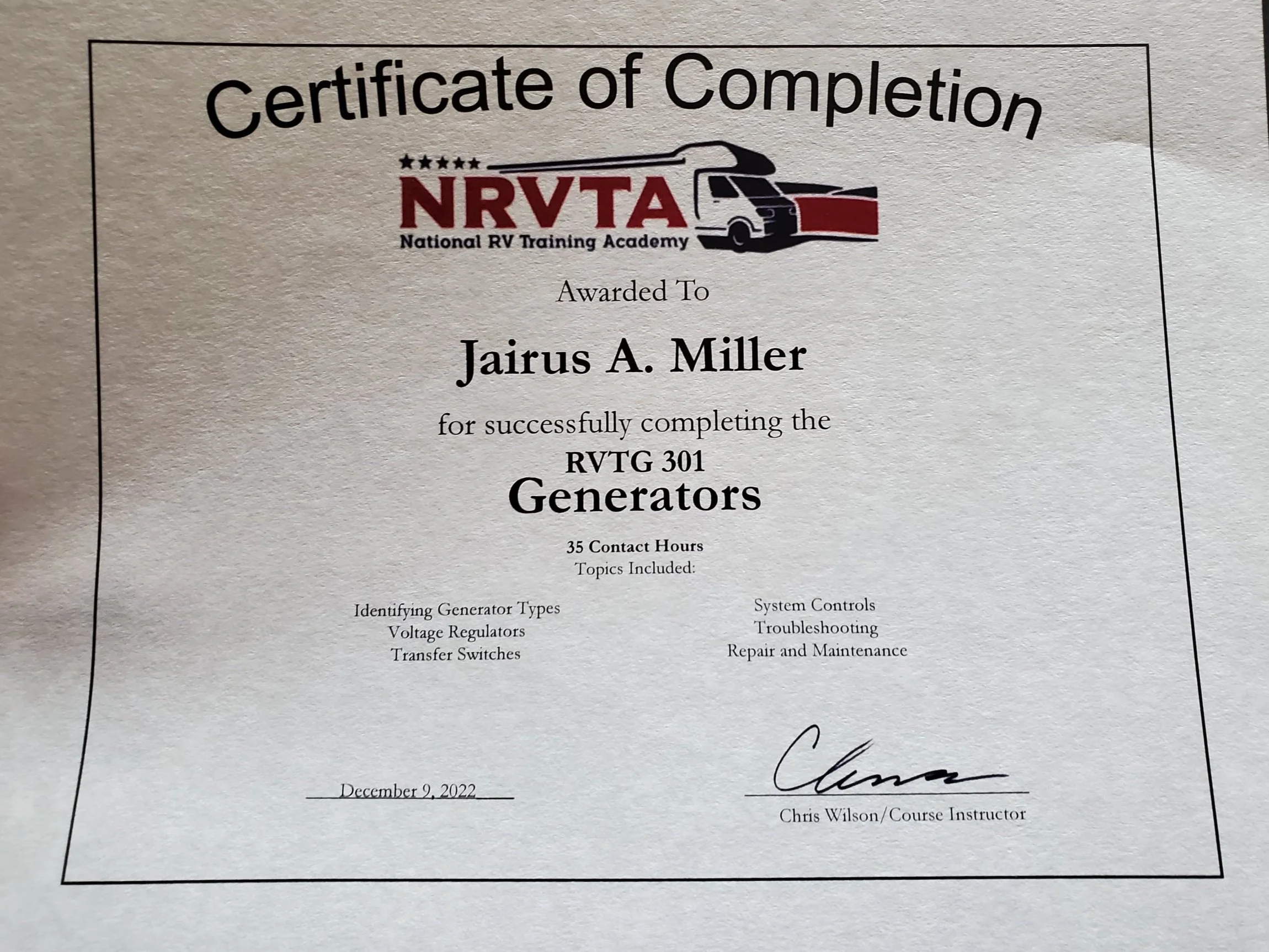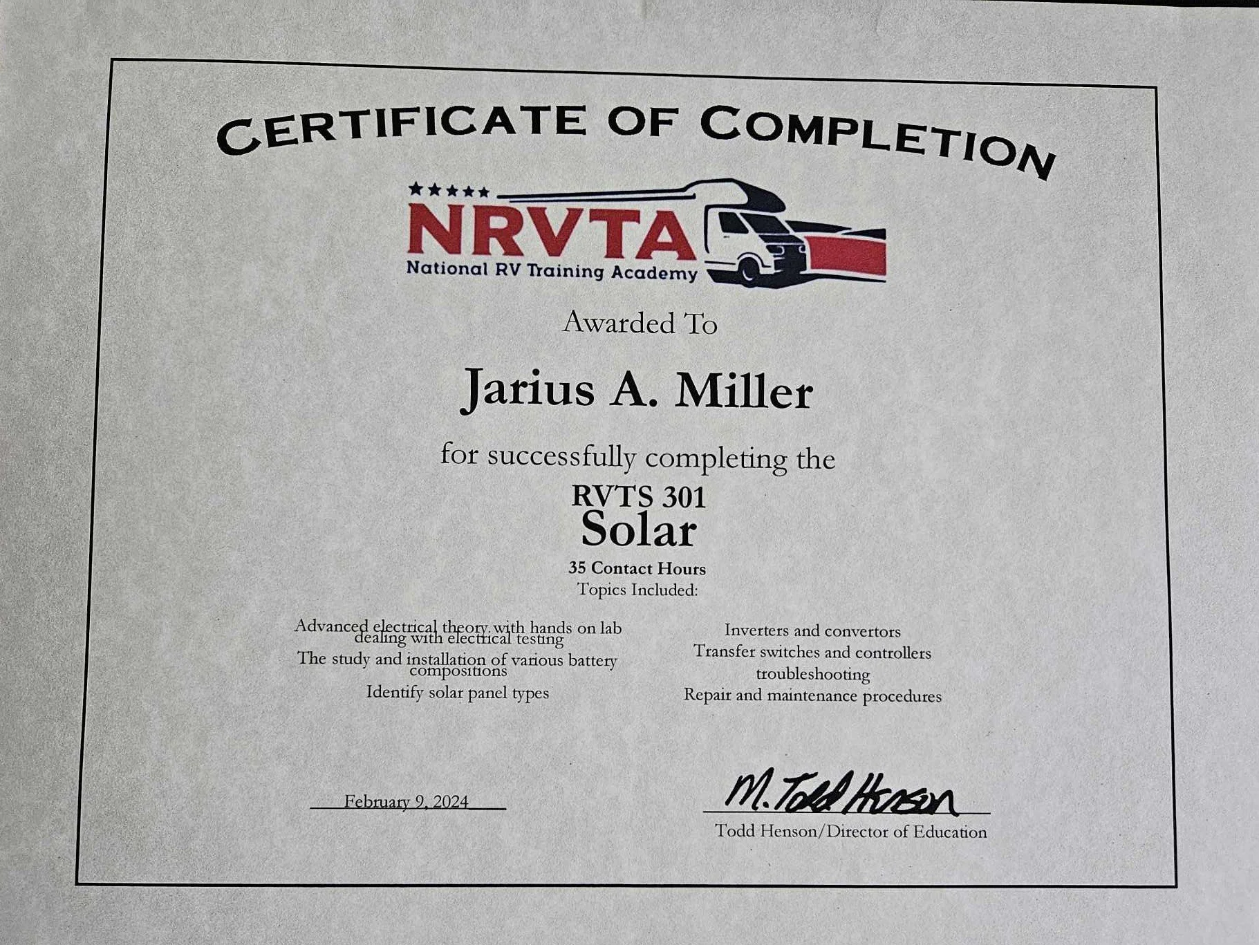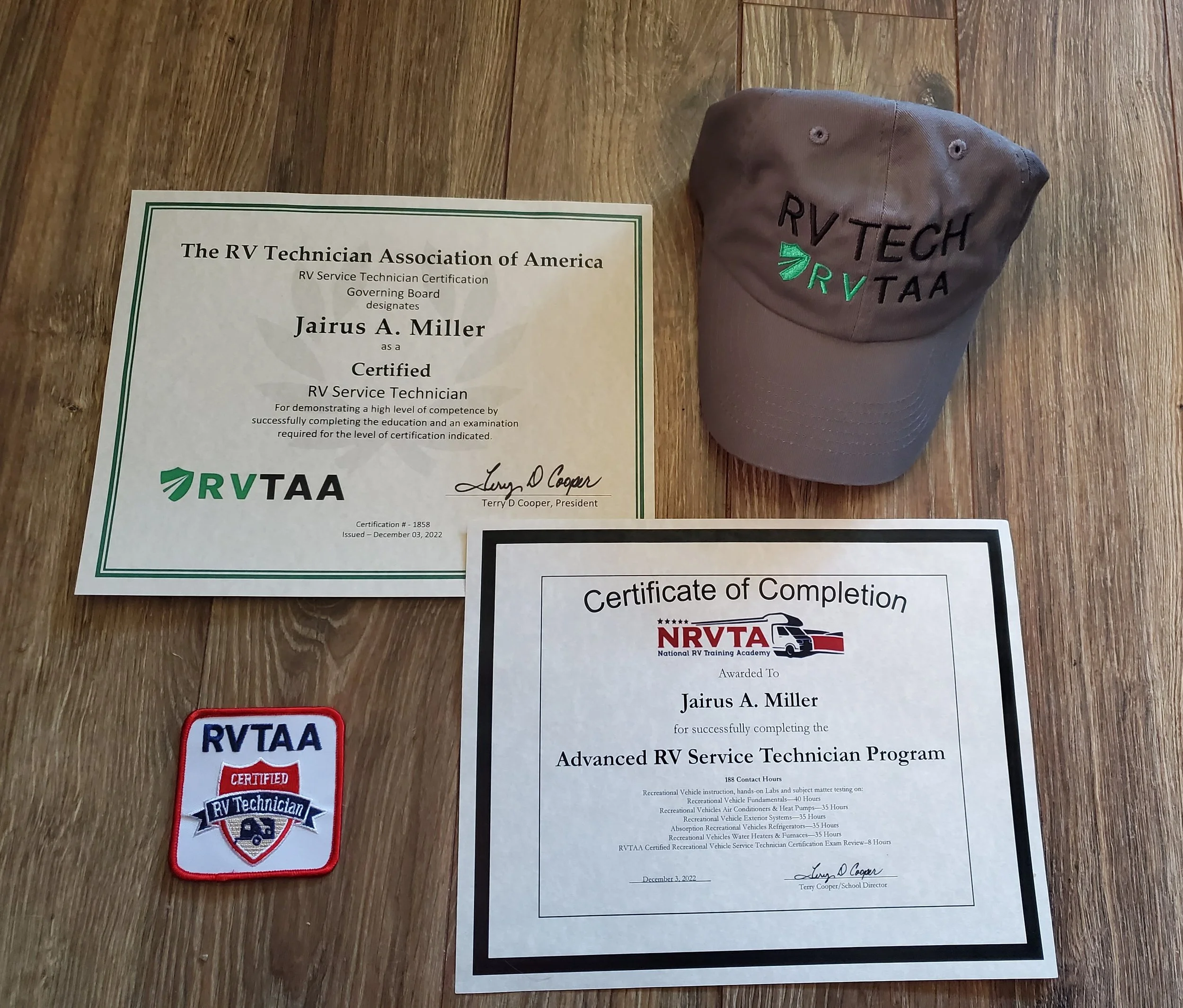 In October 2022, I went to the National RV Training Academy (NRVTA) in Athens, TX and completed all the training and tests to be certified as a RV Service Technician. In January, I completed the training and passed the tests to receive the NRVIA certifications for RV Inspector. I also took specialized courses on generators, propane, tank cleaning, and solar.